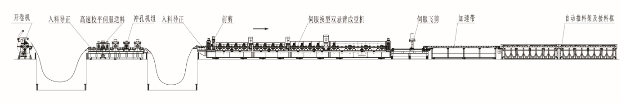 开卷机---入料导正--伺服送料--冲孔机组---导正---前剪---成型部分---伺服飞剪----加速带----自动码垛机