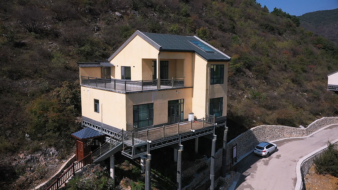 项目采用集术装配建筑结构体系,依托周边山坡,架空建设,建筑结构最大程度减少地表破坏,现场安装过程中无湿作业,对生态环境影响极小,不仅保护了当地生态环境,更以度假民宿形式点缀景区风光,打造契合当地自然景观的旅居体验。